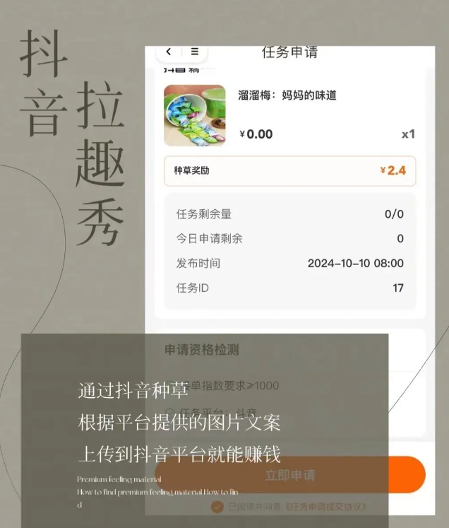 1、通过抖音种草,根据平台提供的图片文案,上传到抖音平台就能赚钱