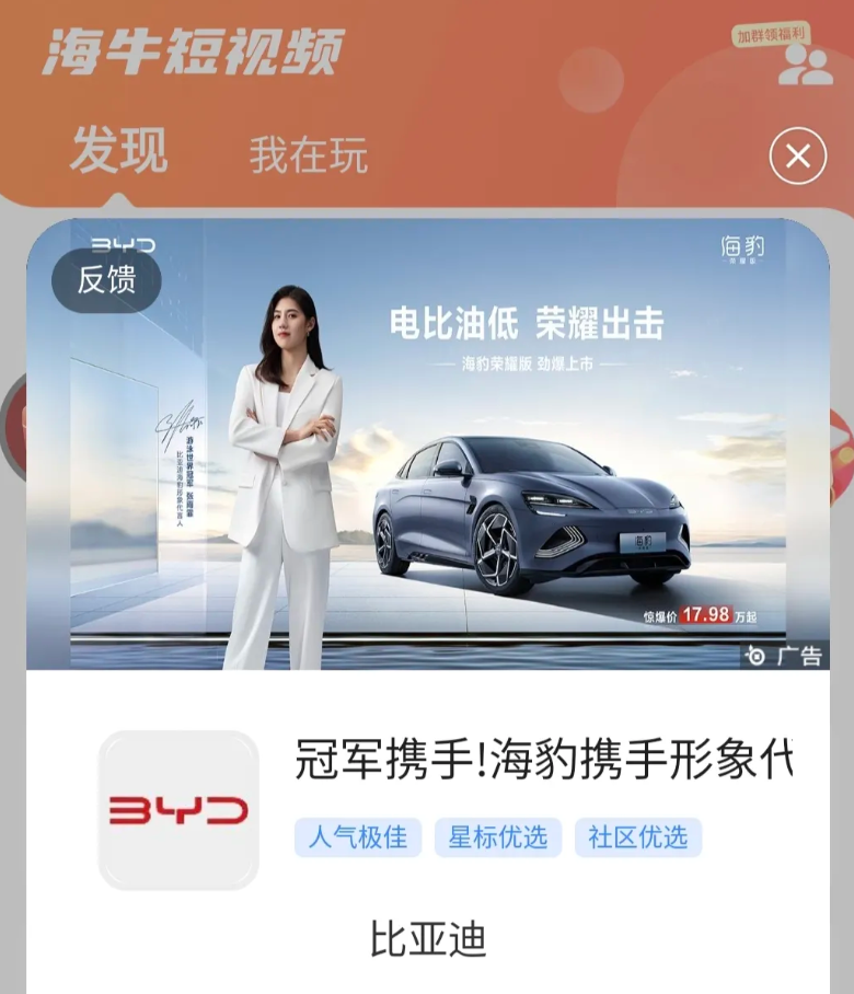 今天打开海牛就给我弹出了车广,说明最近在某音搜了汽车的一些数据流识别到了(穿山甲类的一般在某音搜关键词)。