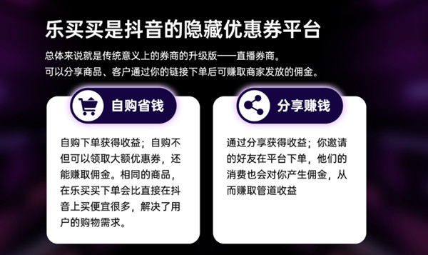 乐买买APP是抖音的隐藏优惠券平台,乐买买为用户提供丰富多样的爆品,用户可以自购,或者一键转链,一键复制推广文案,从而在抖音群以及站外社群进行分发,消费者进入抖音完成购物,无论是直播间还是单品,都可以获得分销收益。